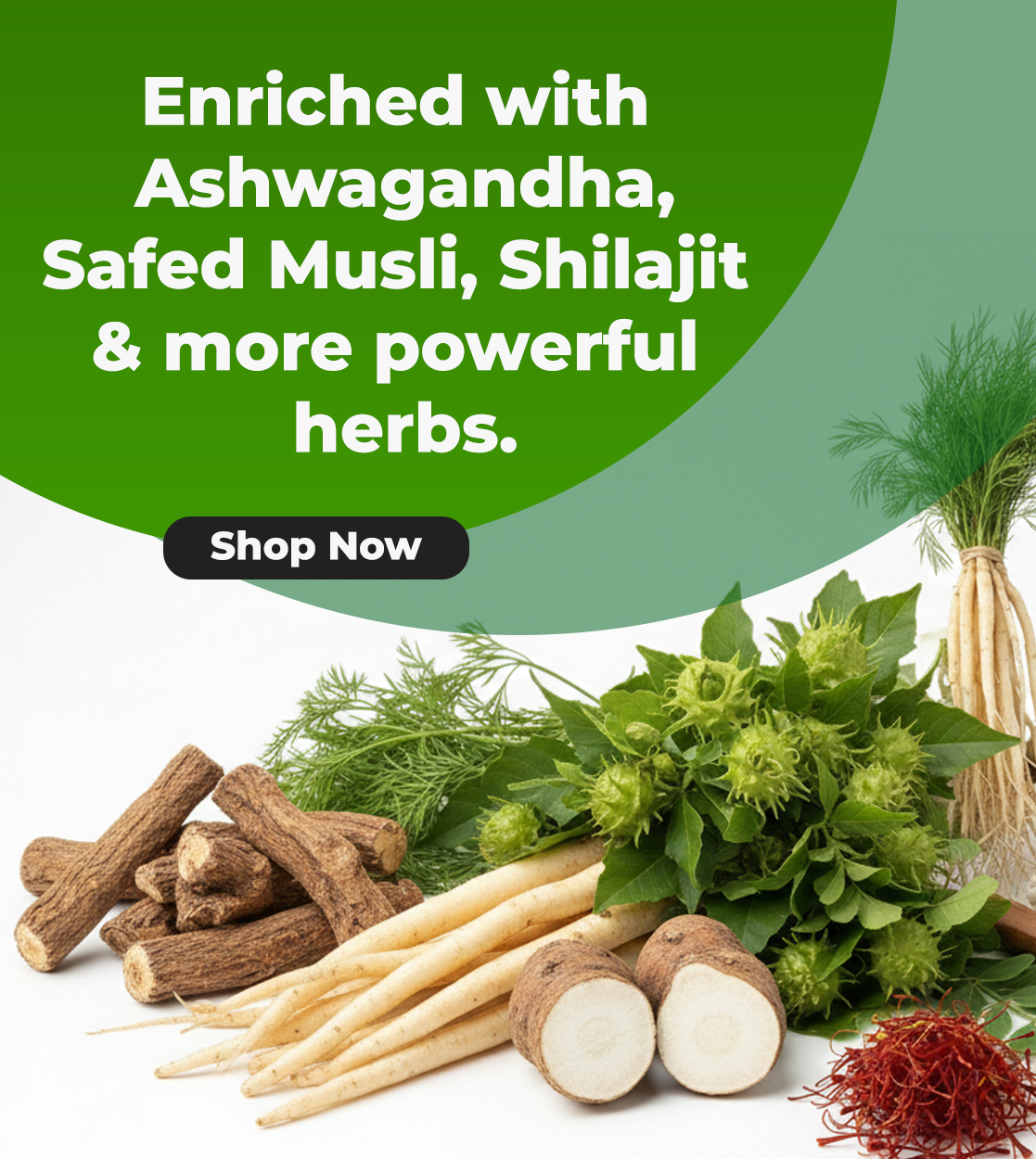 100% standardized herbal extracts. We use the purest Safed Musli and Ashwagandha for guaranteed results.